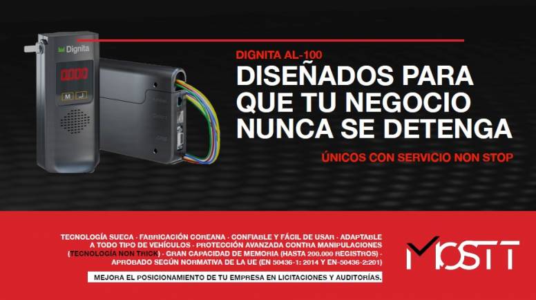 Desde nuestra empresa patrocinadora MOSTT Soluciones Tecnológicas nos hacen llegar una promoción con oferta de descuento especial (10%)* de su producto ALCOHOLÍMETRO ANTIARRANQUE DIGNITA AL100 con calibraciones del dispositivo gratis de por vida. Como ya conoces, los vehículos que se comercialicen de nueva matriculación en la UE desde el 6 de julio de 2022 deben estar dotados de sistemas de seguridad avanzados. Al respecto, todos los vehículos de motor (incluidos camiones, autobuses, furgonetas y vehículos utilitarios deportivos) deberán estar equipados, entre otros elementos de seguridad, con la interfaz para la instalación de alcoholímetros antiarranque.