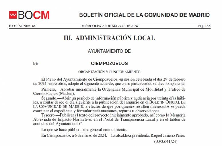 AETRAM ha realizado un conjunto de observaciones a la Ordenanza Municipal de Movilidad y Trafico del municipio de Ciempozuelos dentro del trámite de audiencia e informacion publica establecido, para la presentación de reclamaciones y sugerencias, antes de su aprobación definitiva, y donde además se regulan aspectos relacionados con el transporte escolar que se desarrolle íntegramente en el termino municipal.
