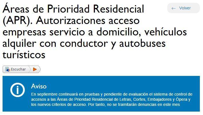 El Ayuntamiento de Madrid informa en su Web sobre la implantación de las zonas APR - Áreas de Prioridad Residencial del Ayuntamiento de Madrid (APR de Letras, APR de Cortes, APR de Embajadores y APR de Ópera) y por el cual la ejecución definitiva del mismo en cuanto al sistema de control de accesos se amplía hasta el próximo mes de octubre, por lo que en el mes de Septiembre no se tramitaran denuncias.