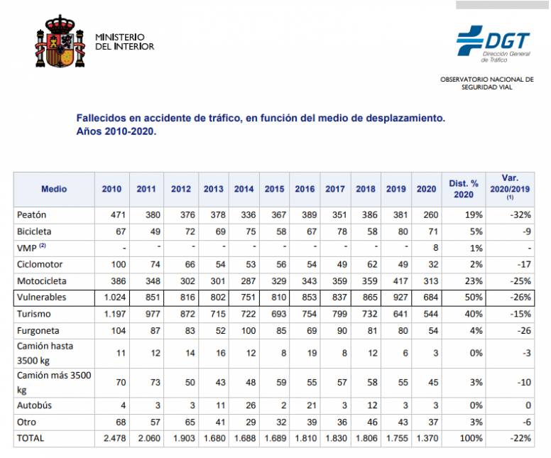La Direccion General de Tráfico ha hecho públicos los datos definitivos del “Balance de las cifras de siniestralidad vial 2020” marcado por la pandemia de COVID-19 en el que el descenso en las cifras de fallecidos en accidentes de tráfico se produjo en un contexto de reducción de los desplazamientos de largo recorrido, que se cifró en un 25%, causado por las restricciones de movilidad impuestas a causa de la pandemia y en el que perdieron la vida en accidentes de tráfico 1.370 personas.