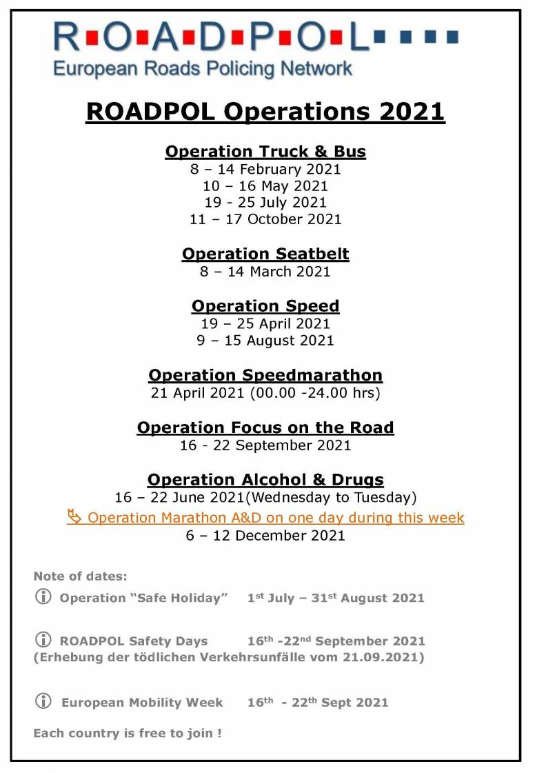 La red europea de policía de tráfico ROADPOL ha previsto para la próxima semana, del 8 al 14 de febrero, la ejecución de la campaña europea conjunta denominada «Truck & Bus». Es la primera de las cuatro campañas de este tipo que tiene planificadas para 2021 (10 a 16 de mayo, 19 a 25 de julio y 11 a 17 de octubre).