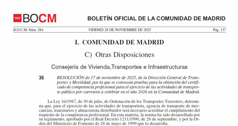 El BOCM de fecha 28/11/2025 publica la RESOLUCIÓN de 17 de noviembre de 2025, de la Dirección General de Transportes y Movilidad, por la que se convocan pruebas para la obtención del certificado de competencia profesional para el ejercicio de las actividades de transporte público por carretera a celebrar en el año 2026 en la Comunidad de Madrid. Esta nueva convocatoria de las pruebas de competencia profesional para el año 2026 en la Comunidad de Madrid tendrá las siguientes características: