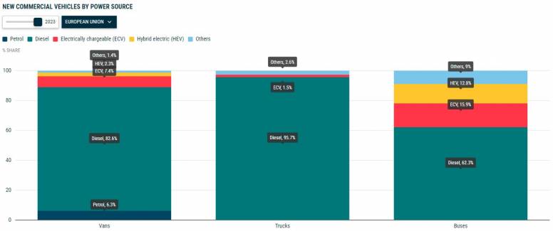 Los autobuses híbridos eléctricos también mostraron cifras positivas a finales de año, experimentando un crecimiento del 115% que casi duplicó la cuota de mercado del 7% al 12,8% en comparación con 2022. Crecimiento notable en los tres principales mercados: Francia (+221,3%), España (+ 172,4%) y Alemania (+37,5%) contribuyeron a este resultado.