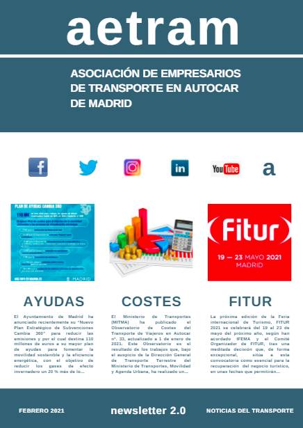 Ya se ha publicado el último Newsletter de AETRAM Noticias del Transporte (Feb/2021) con interesantes noticias relacionadas con el sector de transporte de viajeros por carretera de los servicios discrecionales, regulares temporales y regulares de uso especial de la Comunidad de Madrid y de AETRAM.