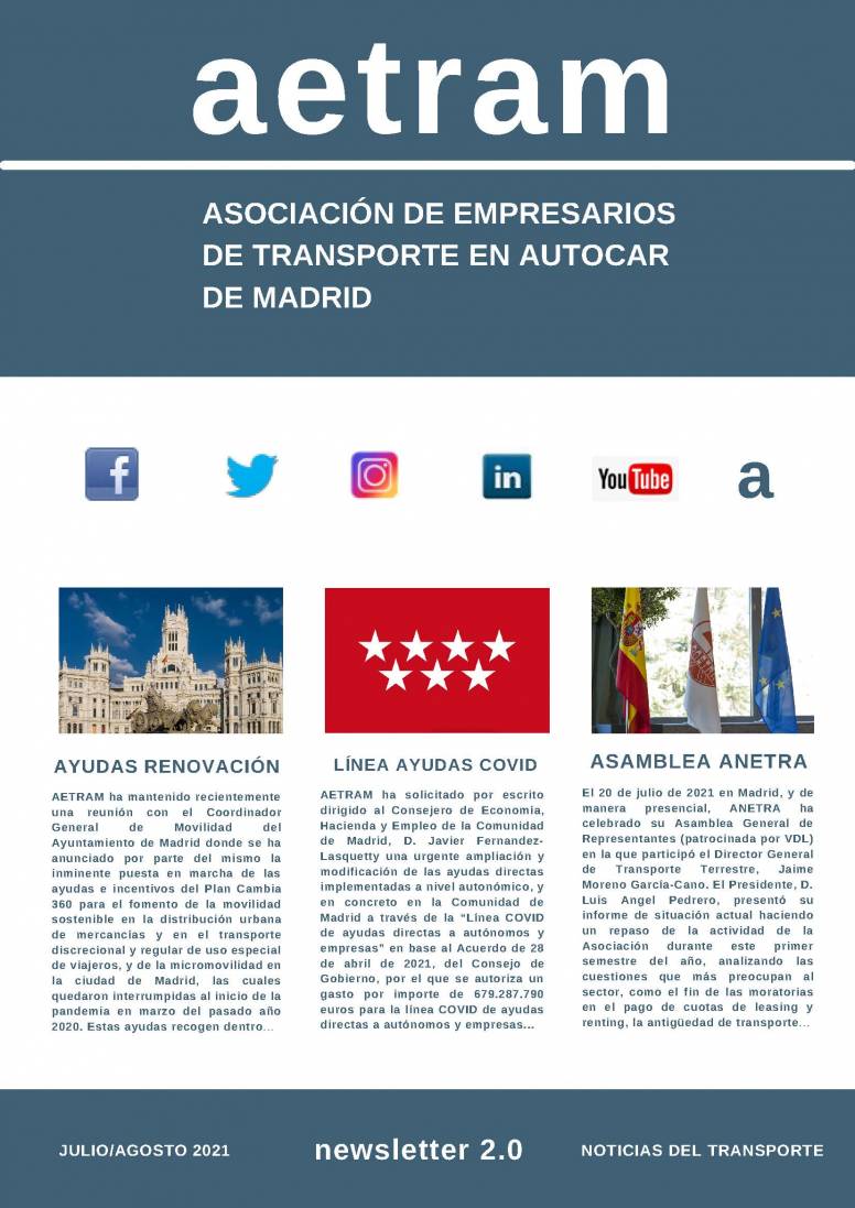 Ya se ha publicado el último Newsletter de AETRAM Noticias del Transporte (JULIO/AGOSTO 2021) con interesantes noticias relacionadas con AETRAM y el sector de transporte de viajeros por carretera de los servicios discrecionales, regulares temporales y regulares de uso especial de la Comunidad de Madrid (MOVIL / WEB).