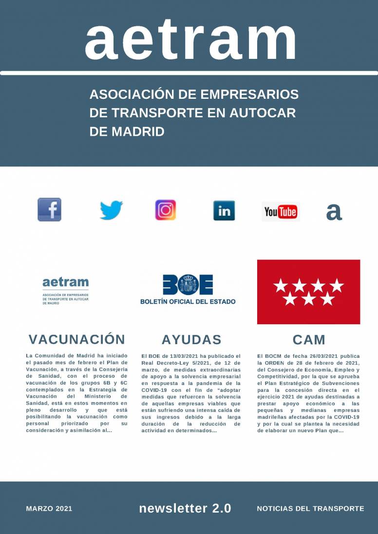 Ya se ha publicado el último Newsletter de AETRAM Noticias del Transporte (Mar/2021) con interesantes noticias relacionadas con AETRAM y el sector de transporte de viajeros por carretera de los servicios discrecionales, regulares temporales y regulares de uso especial de la Comunidad de Madrid .