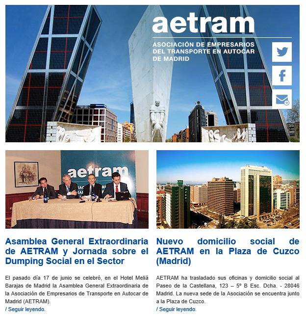 AETRAM ha iniciado en el mes de junio la edición y publicación de un Newsletter mensual titulado “Noticias del Transporte” el cual se envía en formato digital a los socios de AETRAM, profesionales, empresas y otras entidades relacionadas con el Sector.