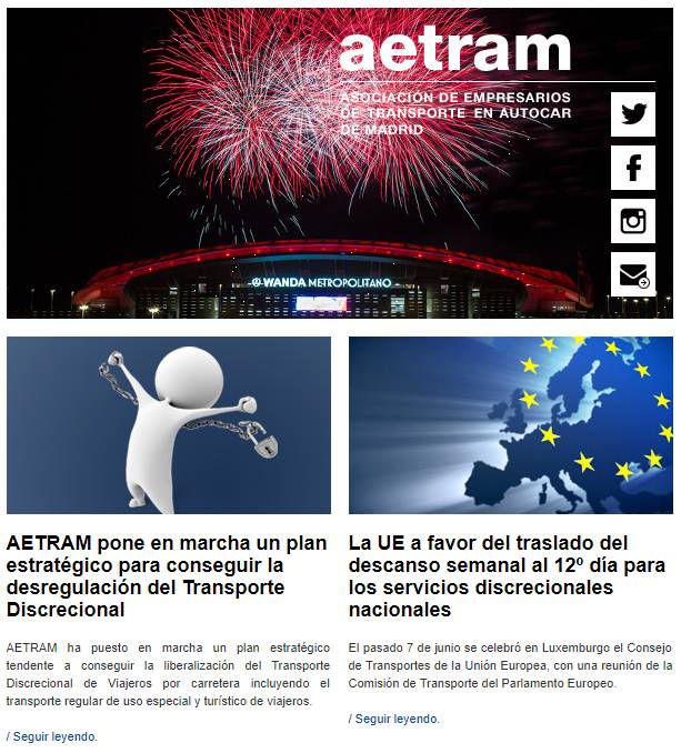 El Newsletter, que posee un diseño actual y moderno, contiene noticias de interés para el Sector, con la actualidad de la Asociación y actividades desarrolladas, siendo una lectura de gran interés para todos los profesionales relacionados y con una alta visibilidad en un formato muy bien valorado por los empresarios, el cual se envía en formato digital a los socios de AETRAM, profesionales, empresas y otras entidades relacionadas con el Sector.