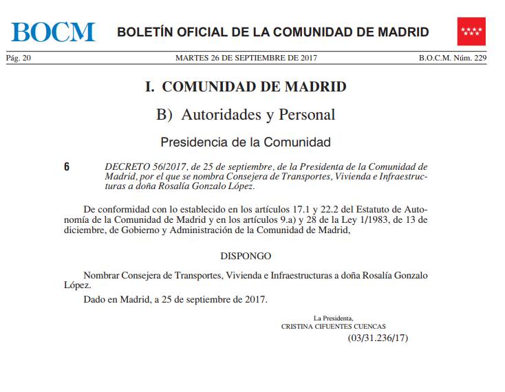 La reestructuración orgánica del Gobierno de la Comunidad de Madrid va acompañada de nuevos nombramientos entre los que se encuentra el de la Consejería de Transportes, Vivienda e Infraestructuras, la cual es asumida a partir de ahora por Rosalía Gonzalo López, diputada de la Asamblea de Madrid, y Secretaria Primera de la Mesa de este Parlamento. El nombramiento oficial se ha producido tras publicación del mismo en el BOCM de fecha 26 de septiembre de 2017.