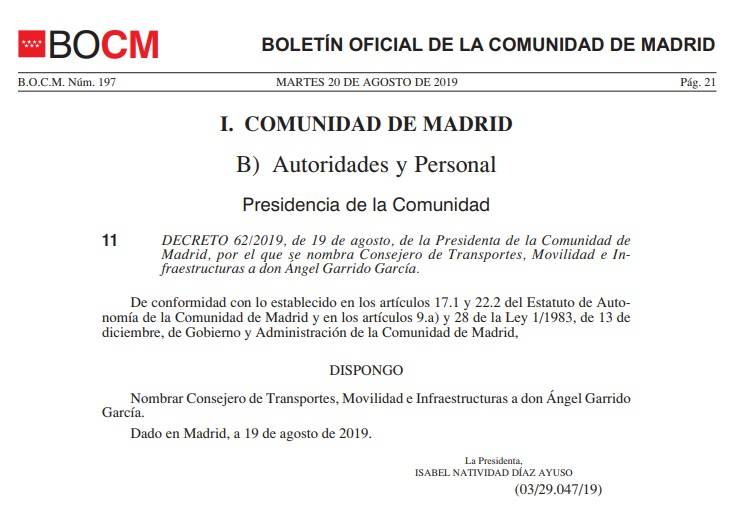 La reestructuración orgánica del Gobierno de la Comunidad de Madrid va acompañada de nuevos nombramientos entre los que se encuentra el de la Consejería de Transportes, Vivienda e Infraestructuras, la cual es asumida a partir de ahora por Ángel Garrido Garcia, expresidente de la Comunidad de Madrid por el Partido Popular y diputado autonomico de Ciudadanos. El nombramiento oficial se ha producido tras publicación del mismo en el BOCM de fecha 20 de agosto de 2019.