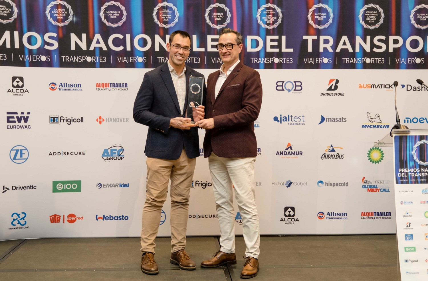David del Olmo, Presidente de la Asociación, fue el encargado de entregar uno de los premios, concretamente en la categoría de “Microbús del Año 2026 en España” al modelo TGE Next Level Burillo de Man (Ignacio Bendala, Director Comercial de autobuses de MAN Truck & Bus Iberia).