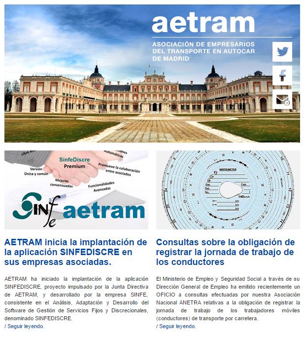 Ya se ha publicado un nuevo Newsletter de AETRAM Noticias del Transporte correspondiente al mes de Febrero (2) de 2017, con interesantes noticias relacionadas con el sector del transporte de viajeros por carretera de los servicios discrecionales, regulares temporales y regulares de uso especial de la Comunidad de Madrid y de AETRAM.