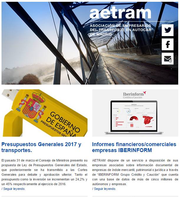 Ya se ha publicado un nuevo Newsletter de AETRAM Noticias del Transporte correspondiente al mes de Mayo de 2017, con interesantes noticias relacionadas con el sector de transporte de viajeros por carretera de los servicios discrecionales, regulares temporales y regulares de uso especial de la Comunidad de Madrid y de AETRAM.