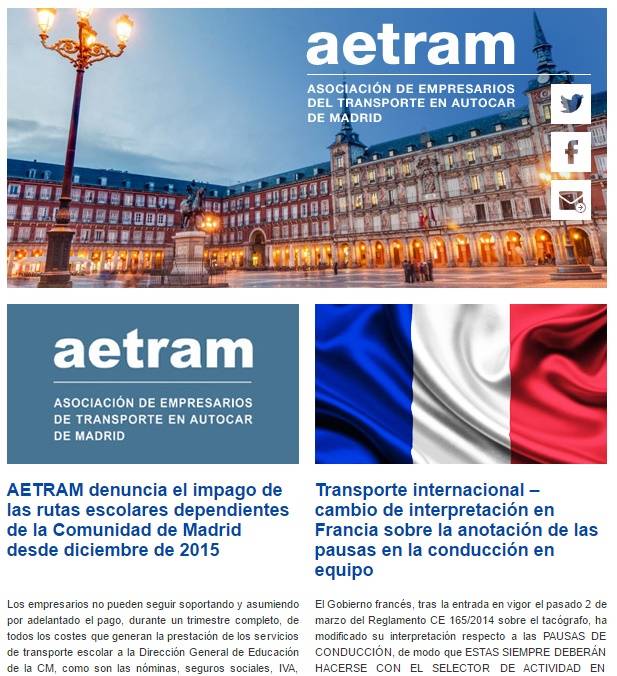 Ya se ha publicado el nuevo Newsletter de AETRAM Noticias del Transporte correspondiente al mes de Abril de 2016, con interesantes noticias relacionadas con el sector del transporte de viajeros por carretera de los servicios discrecionales, regulares temporales y regulares de uso especial de la Comunidad de Madrid y de AETRAM.