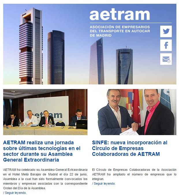 Ya se ha publicado el nuevo Newsletter de AETRAM Noticias del Transporte correspondiente al mes de Junio de 2016, con interesantes noticias relacionadas con el sector del transporte de viajeros por carretera de los servicios discrecionales, regulares temporales y regulares de uso especial de la Comunidad de Madrid y de AETRAM.