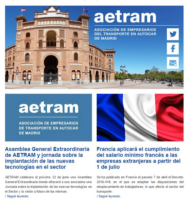Ya se ha publicado el nuevo Newsletter de AETRAM Noticias del Transporte correspondiente al mes de Mayo de 2016, con interesantes noticias relacionadas con el sector del transporte de viajeros por carretera de los servicios discrecionales, regulares temporales y regulares de uso especial de la Comunidad de Madrid y de AETRAM.