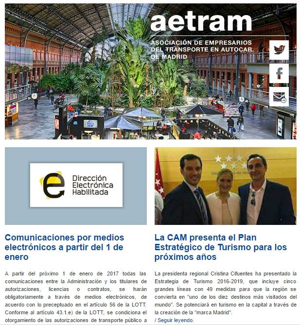 Ya se ha publicado el nuevo Newsletter de AETRAM Noticias del Transporte correspondiente al mes de Septiembre de 2016, con interesantes noticias relacionadas con el sector del transporte de viajeros por carretera de los servicios discrecionales, regulares temporales y regulares de uso especial de la Comunidad de Madrid y de AETRAM.
