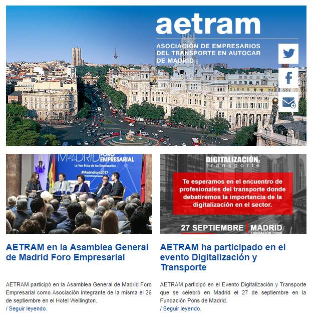 Ya se ha publicado un nuevo Newsletter de AETRAM Noticias del Transporte correspondiente al mes de Octubre de 2017, con interesantes noticias relacionadas con el sector de transporte de viajeros por carretera de los servicios discrecionales, regulares temporales y regulares de uso especial de la Comunidad de Madrid y de AETRAM.