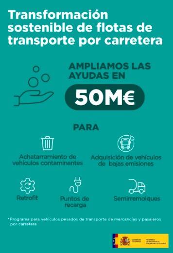 El Ministerio ha decidido reforzar con fondos propios el prepuesto del programa de transformación de flotas para dar una primera respuesta al éxito de este, sin perjuicio de futuros planes de renovación de vehículos, y así seguir impulsando la descarbonización de un sector esencial para la economía, como es el transporte de mercancías y viajeros por carretera. Así, el nuevo presupuesto se destinará a cubrir las solicitudes de ayudas ya presentadas en el marco del programa, cuya convocatoria cerró el pasado 30 de abril, y que no han podido ser atendidas por falta de fondos.